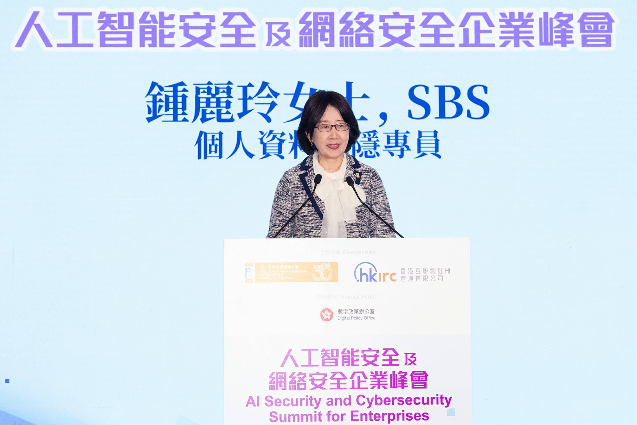 私隱專員鍾麗玲女士, SBS致歡迎辭時表示:「私隱專員公署開展多項『AI安全』及『數據安全』的工作,但我們明白,維護安全沒有『完成時』,只有『進行時』。風險隨着科技發展而變化,企業的應對策略和措施亦要與時並進。今日的峰會,正正希望提供一個平台,讓各界深入交流,互相借鑒,共同提升應對人工智能安全及網絡安全風險的意識與能力。為進一步協助機構築牢安全屏障,公署亦將於今年第二季推出數據安全套餐,當中包含送出參與研習班的免費名額。」