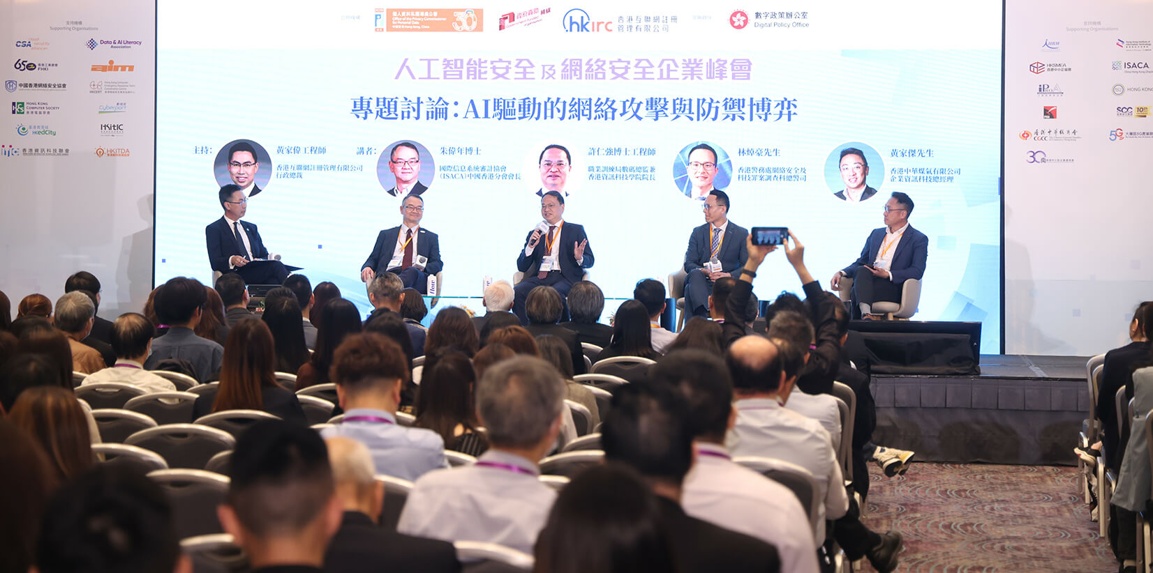 峰會亦設有兩個專題討論環節。在題為「AI驅動的網絡攻擊與防禦博弈」的專題討論上,由國際信息系統審計協會(ISACA)中國香港分會會長朱偉年博士、職業訓練局數碼總監兼香港資訊科技學院院長許仁強博士工程師、香港警務處網絡安全及科技罪案調查科總警司林焯豪先生,以及香港中華煤氣有限公司企業資訊科技總經理黃家傑先生擔任嘉賓講者,深入探討最新網絡攻防形勢。