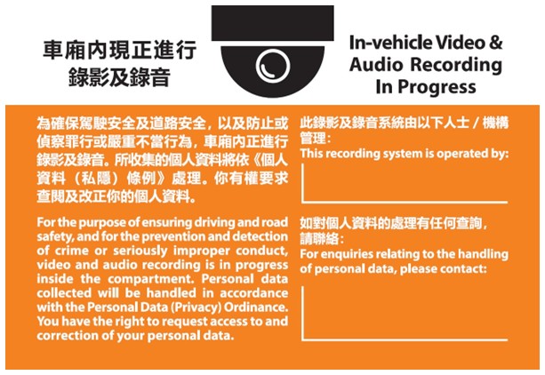 Regarding the installation of in-vehicle cameras, the Privacy Commissioner noted that vehicle compartments are semi-private spaces, and recommended notices be posted by operators of in-vehicle cameras to notify passengers of the existence and functions of the cameras. The newly issued guidance also includes a sample sticker on the notice for in-vehicle cameras for use in passenger-carrying vehicles. In addition, footages captured must be properly handled, including specifying data retention periods and access controls.