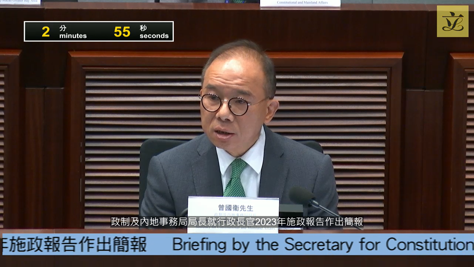 政制及内地事务局局长曾国衞, GBS, IDSM, JP于2023年11月20日出席立法会政制事务委员会政策简报会,简介《行政长官2023年施政报告》有关政制事务的政策措施。个人资料私隐专员(私隐专员)钟丽玲亦出席会议,回答立法会议员有关个人资料私隐及个人资料私隐专员公署(私隐专员公署)工作的问题。