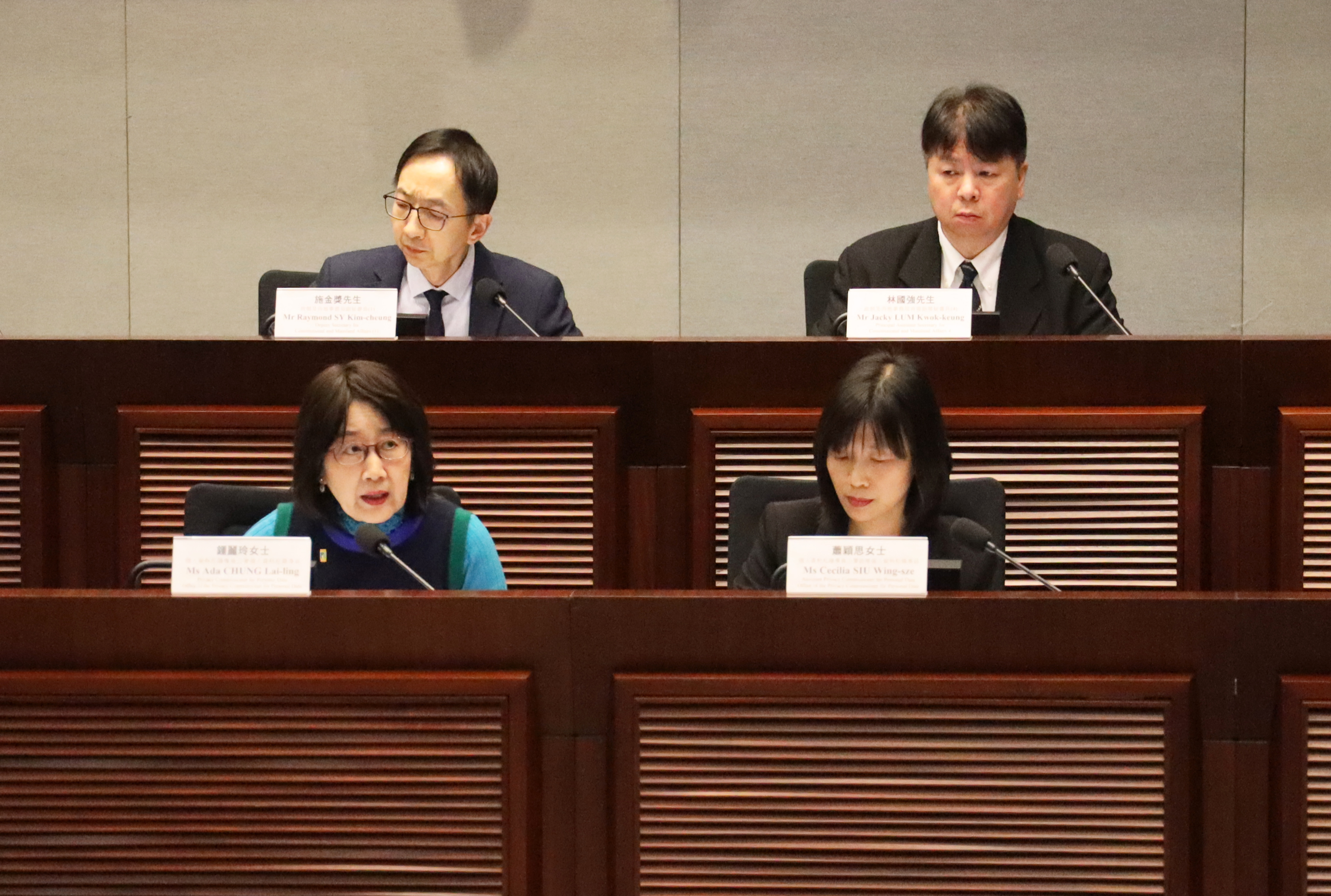 私隐专员钟丽玲(前排左)、助理私隐专员(法律、环球事务及研究)萧颖思(前排右)、政制及内地事务局副秘书长(1)施金奖, JP(后排左)及政制及内地事务局首席助理秘书长(4)林国强(后排右)出席立法会政制事务委员会会议。