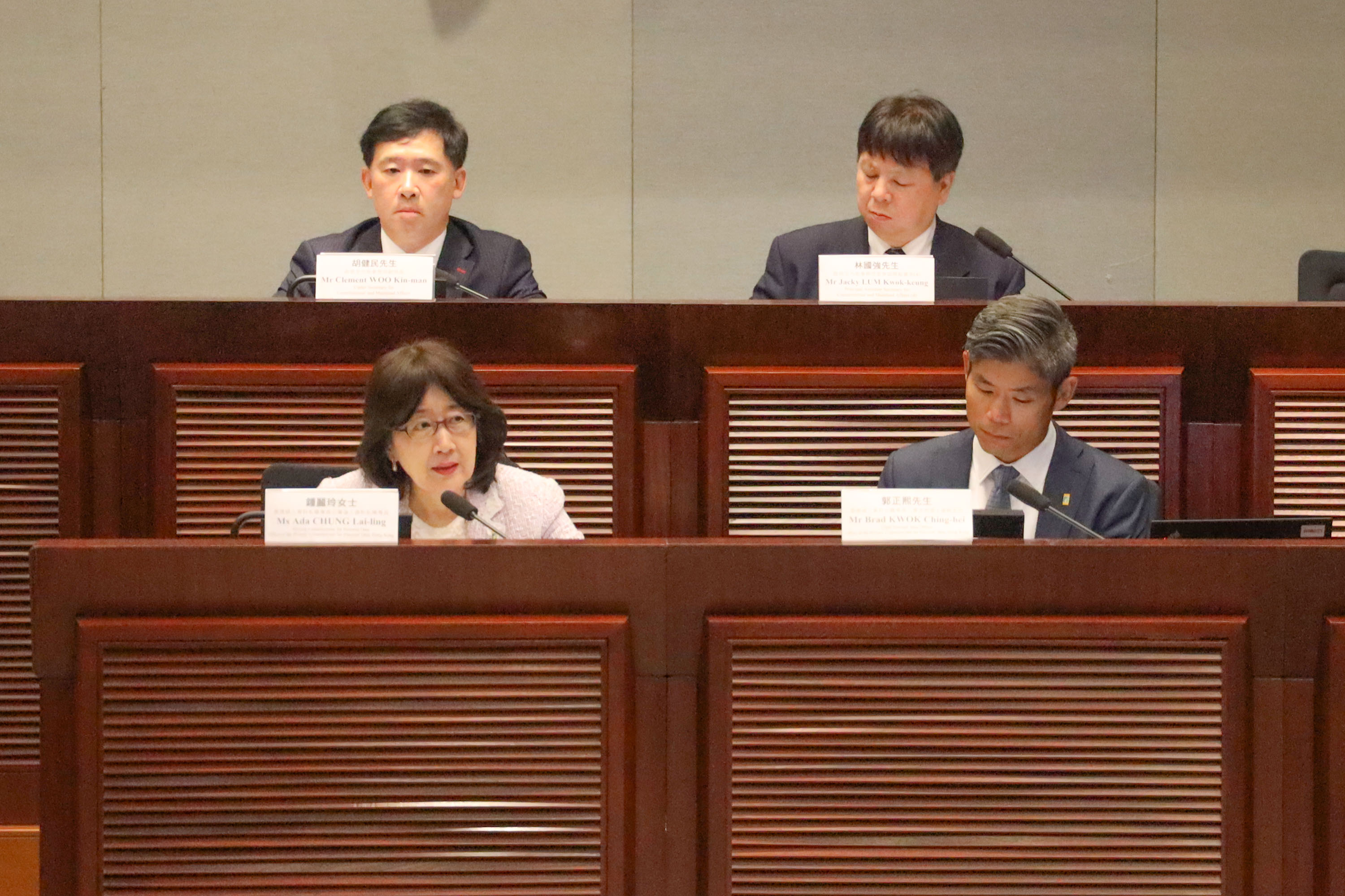 私隐专员钟丽玲(前排左)、首席个人资料主任(合规及查询)郭正熙(前排右)、政制及内地事务局副局长胡健民, MH, JP(后排左)及政制及内地事务局首席助理秘书长(4)林国强(后排右)出席立法会政制事务委员会会议。
