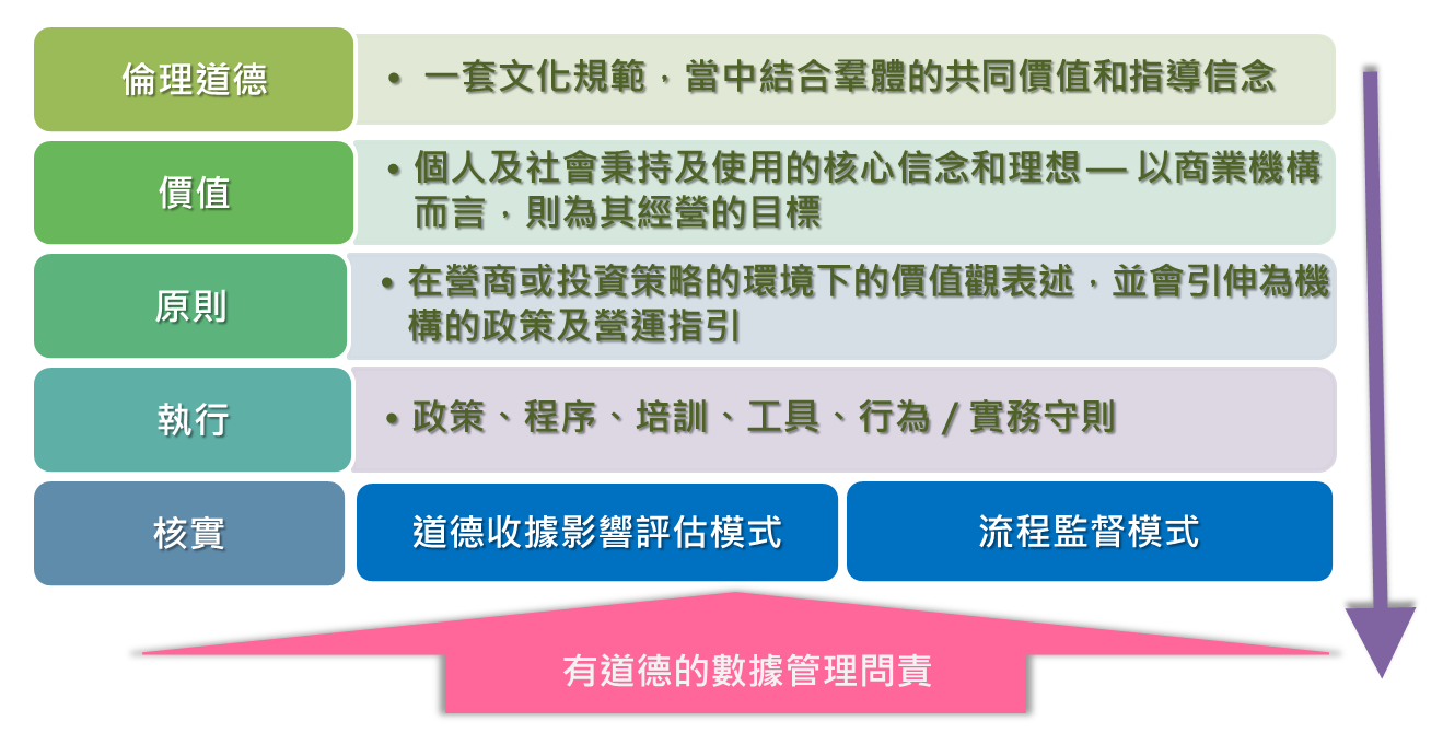 界定数据管理价值(data stewardship values),再发展成各项指引原则,继而转化成机构的道德数据处理政策和流程。