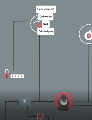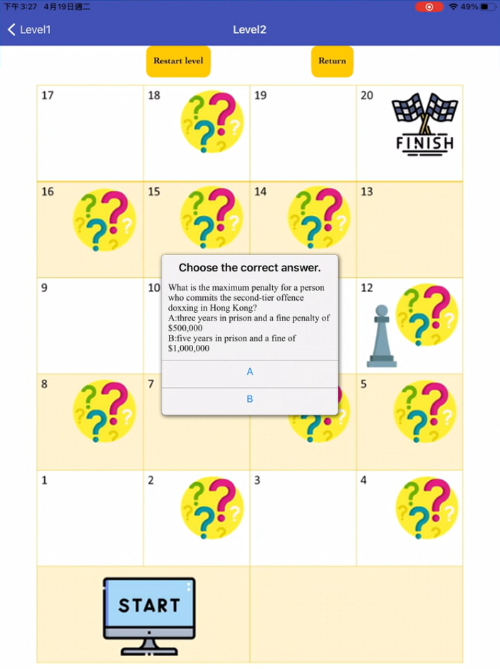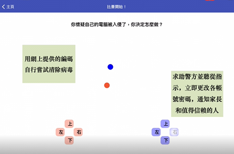 亚军(左)得奖队伍同样来自圣保禄学校,队员包括冯靖雯及陈凯琳同学,他们利用家传户晓的康乐棋配上问答题目,让玩家透过思考问题从中加深对网络欺凌和「起底」的认识。季军(右)由岭南衡怡纪念中学的队伍夺得,队员包括苏彼特、吕俊颖、刘轩综、梁皓尧、刘俊宏、甄梓巽、李浩恩及朱佩嘉同学,其作品模拟登记帐户时可供选择的情景,体验性十足。