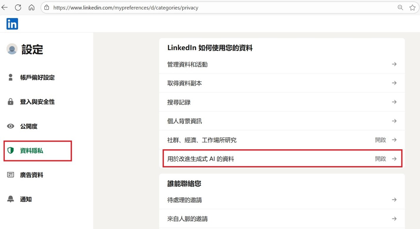 1. 前往帐户设定中的「资料隐私」部分,然后选择「用于改进生成式AI的资料」以找到相关选项。