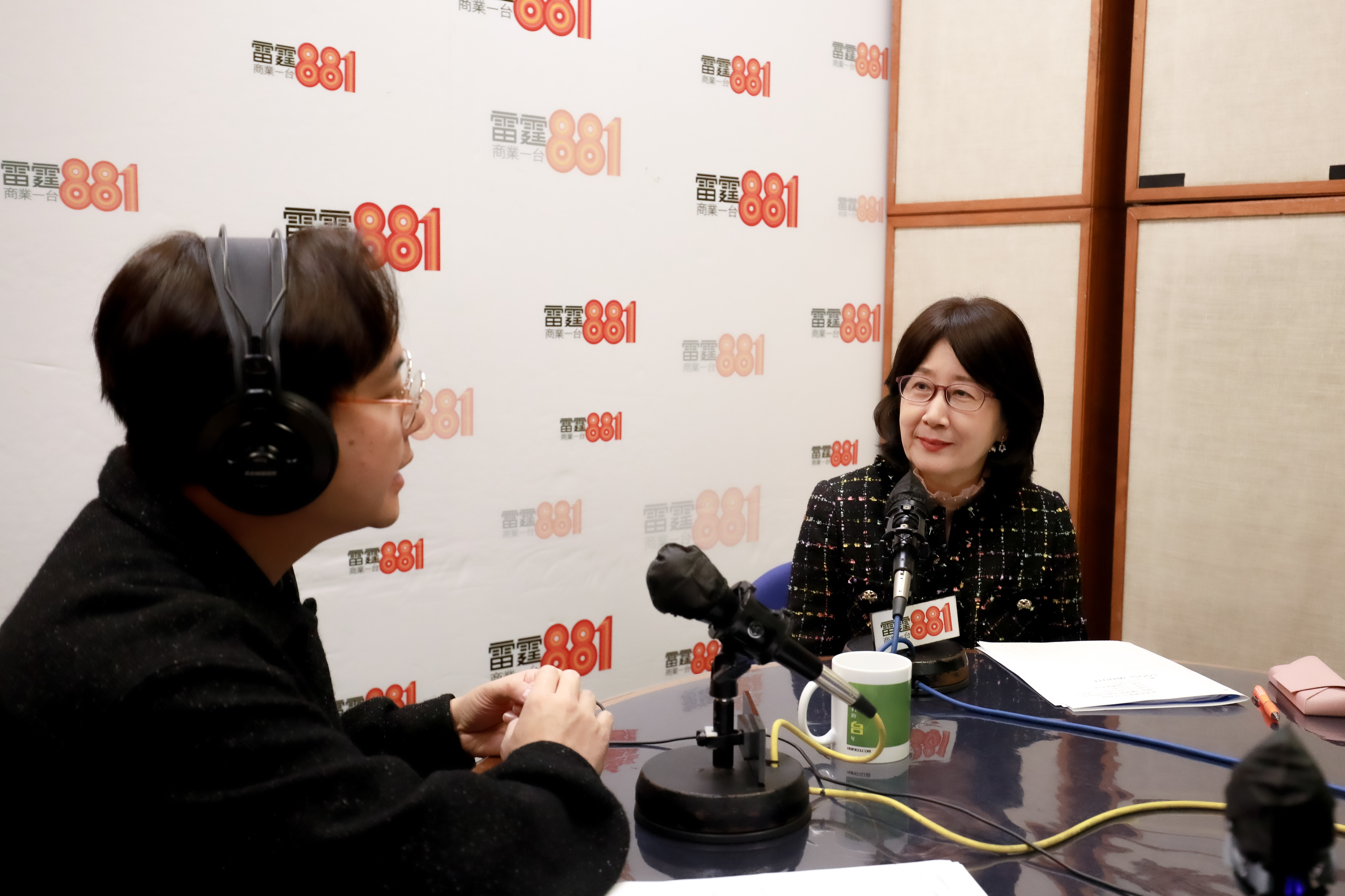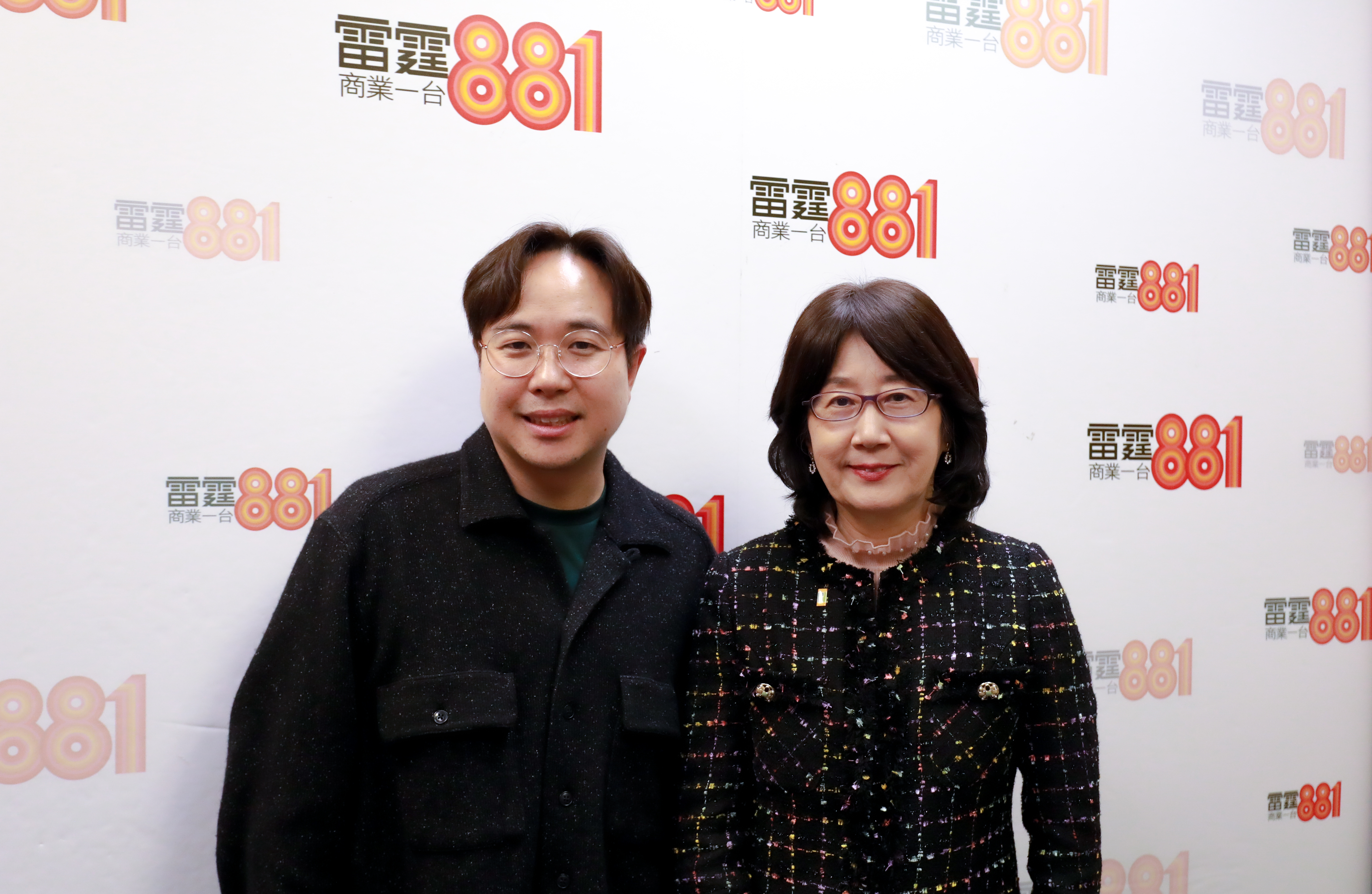 私隐专员钟丽玲(右)与商业电台第一台雷霆881节目主持郭志仁(左)录制《数码安全开心share》。