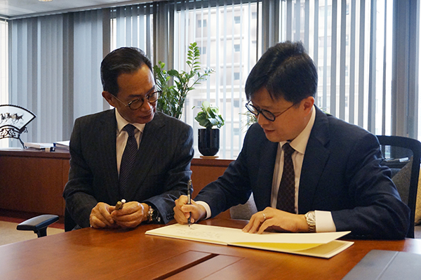 新加坡个人资料保护委员会副专员杨子健(右)在私隐专员黄继儿陪同下于公署嘉宾名册签名留念。