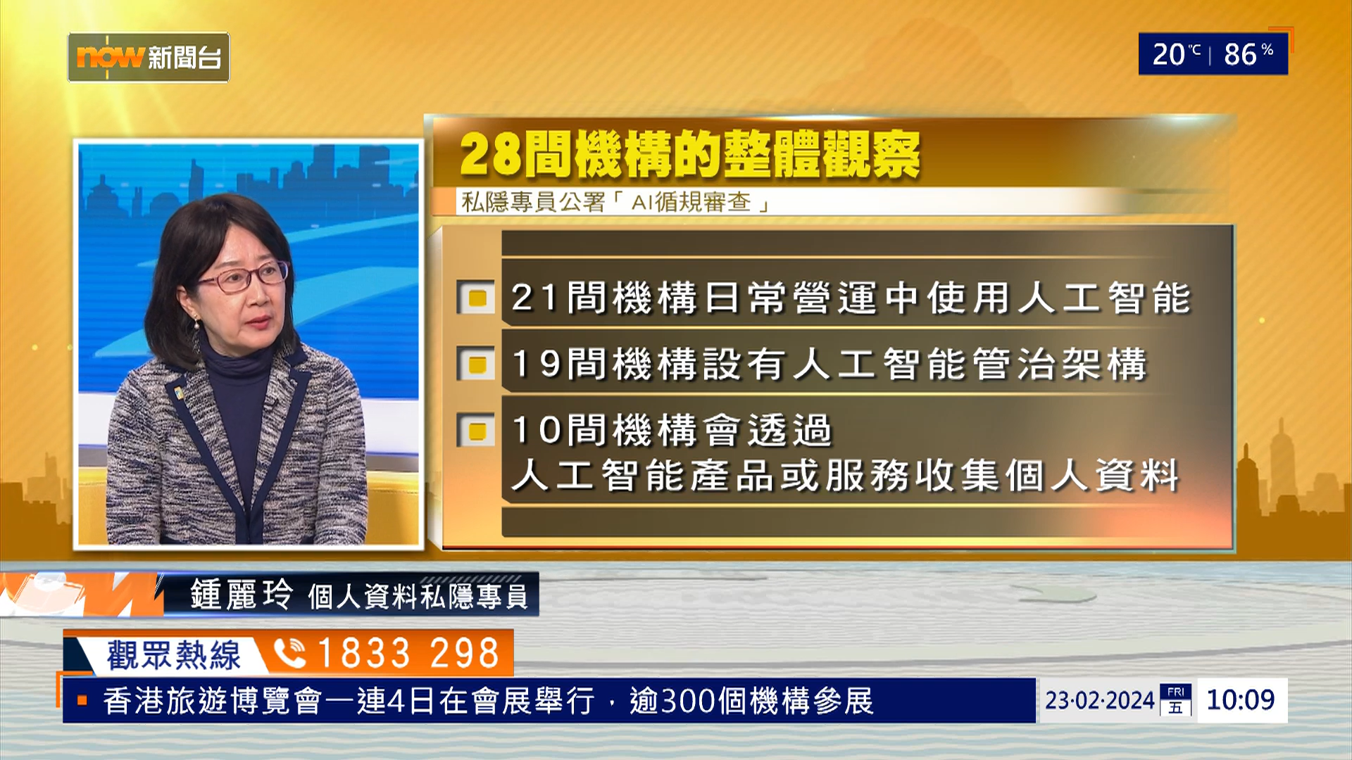 个人资料私隐专员(私隐专员)钟丽玲于2月23日接受Now新闻台《时事全方位》访问,讲述个人资料私隐专员公署(私隐专员公署)审查机构使用人工智能的审查报告,及向市民提供在使用人工智能时的「自保」贴士。