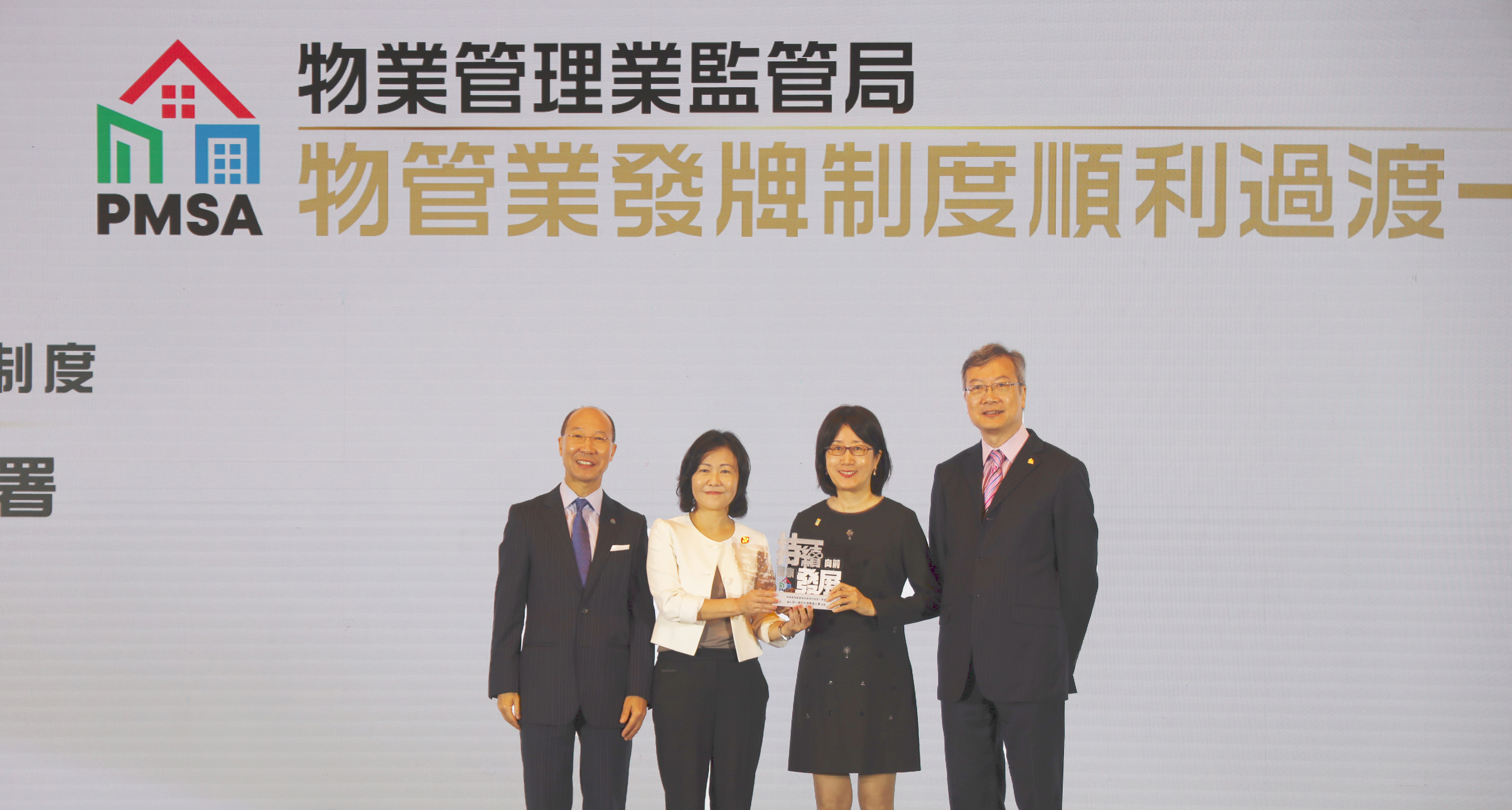 私隐专员钟丽玲(右二)出席物管业发牌制度顺利过渡一周年典礼并接受民政事务总署署长张赵凯渝,太平绅士(左二)、物业管理业监管局主席黄江天博士,铜紫荆星章,太平绅士(左一)及副主席许智文教授,荣誉勳章,太平绅士(右一)颁发的感谢状。
