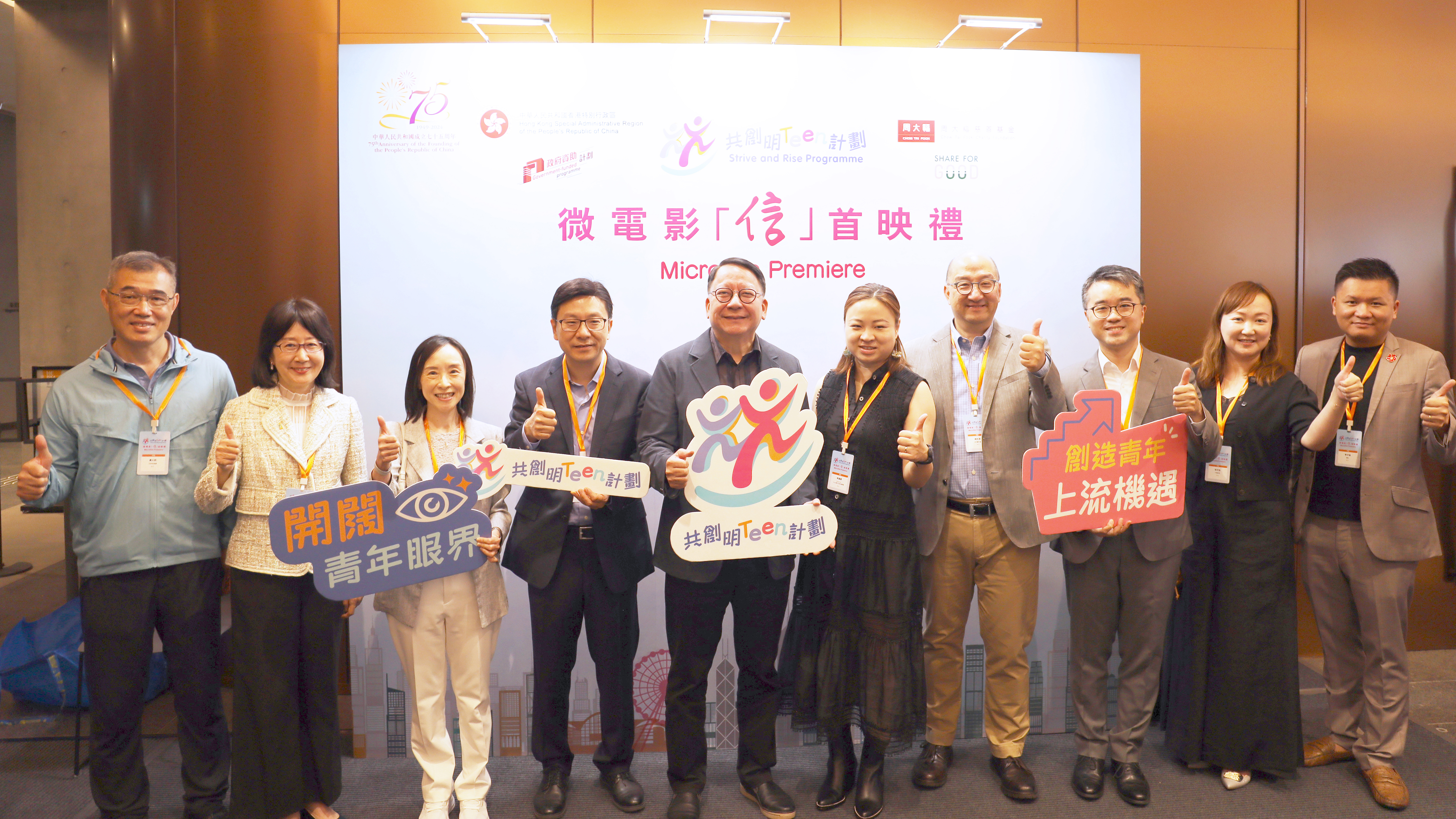 私隐专员钟丽玲(左二)出席「共创明『Teen』计划」微电影首映礼,并与政务司司长陈国基, GBS, IDSM, JP (左五)、劳工及福利局局长孙玉菡, JP(左四)、教育局副局长施俊辉, JP(右三)、社会福利署署长李佩诗, JP(左三)、香港赛马会公司事务执行总监谭志源, GBS, JP(右四)及其他嘉宾合照。