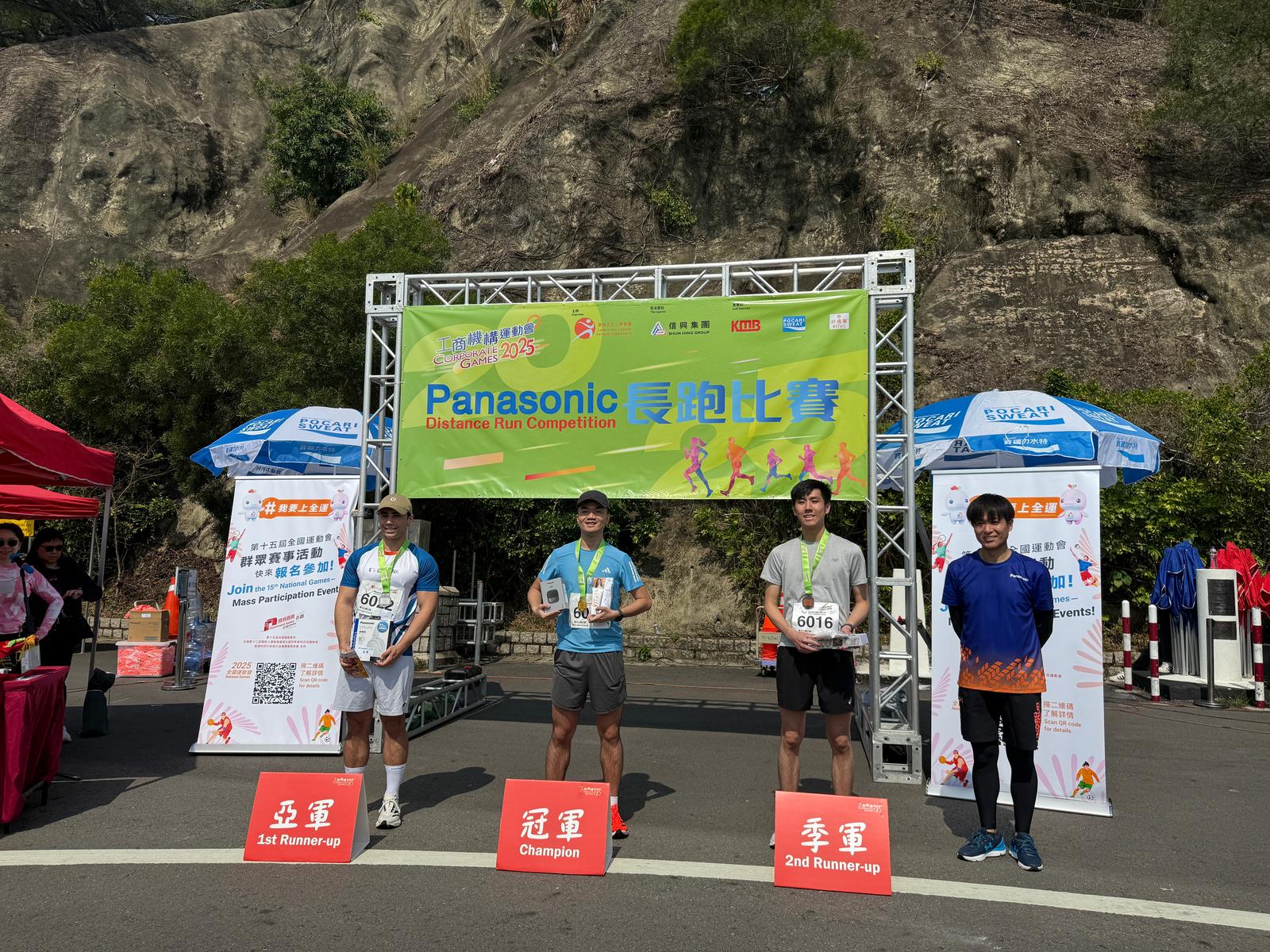 个人资料助理(合规)陈焯彦(左二)及助理个人资料主任(投诉)刘湛晴(右二)分别获得「工商机构运动会2025」长跑比赛男子公开乙组个人冠军及季军。