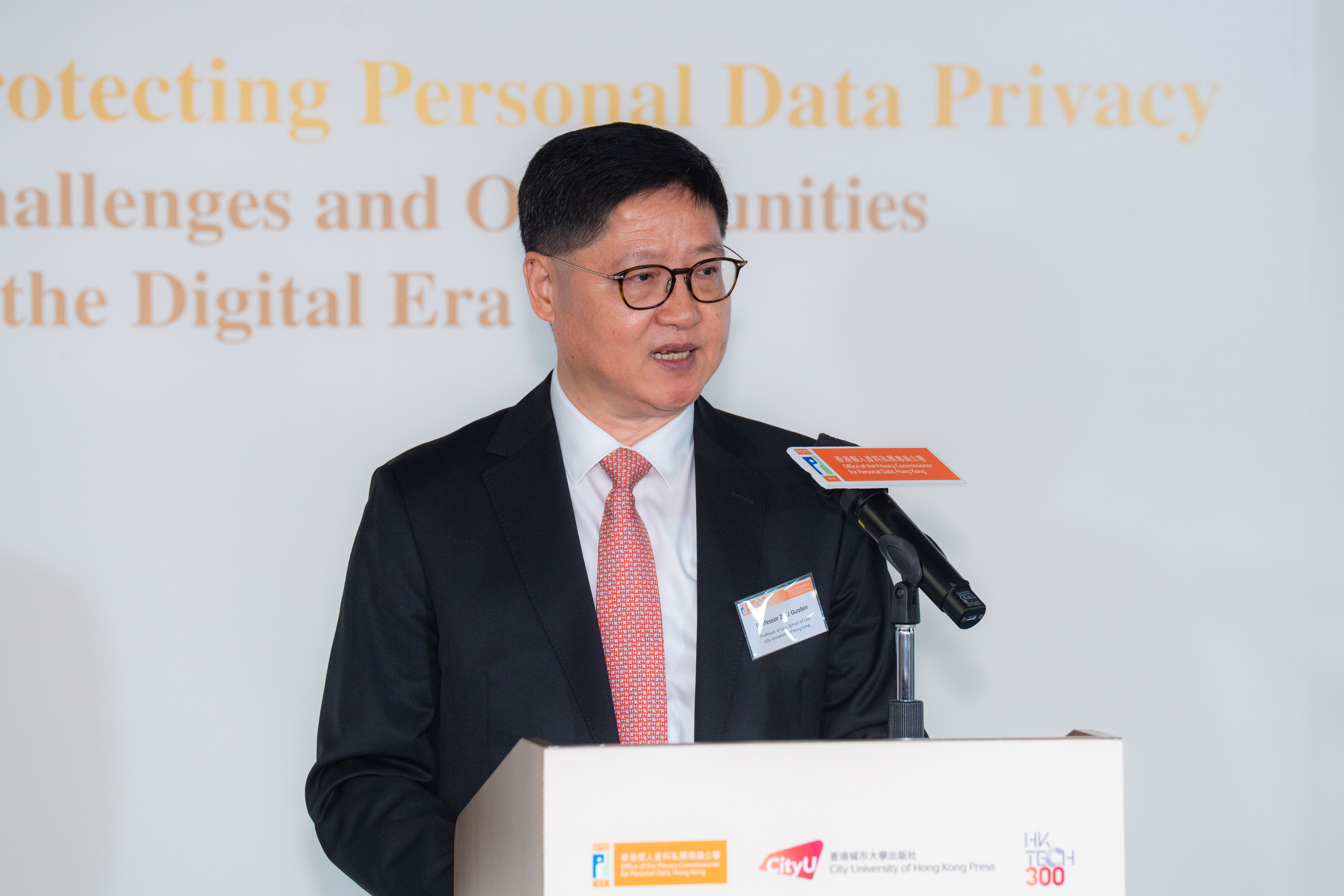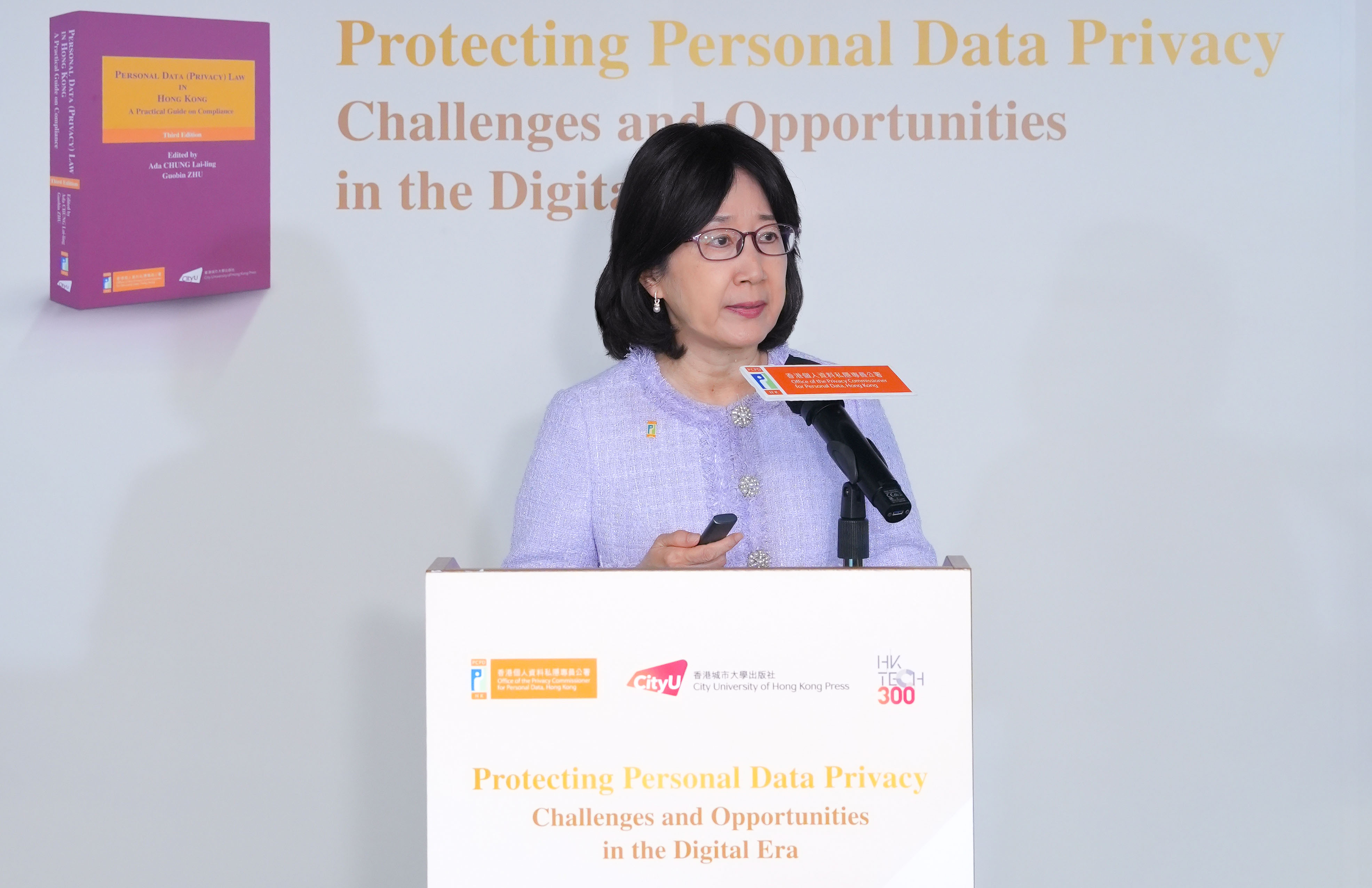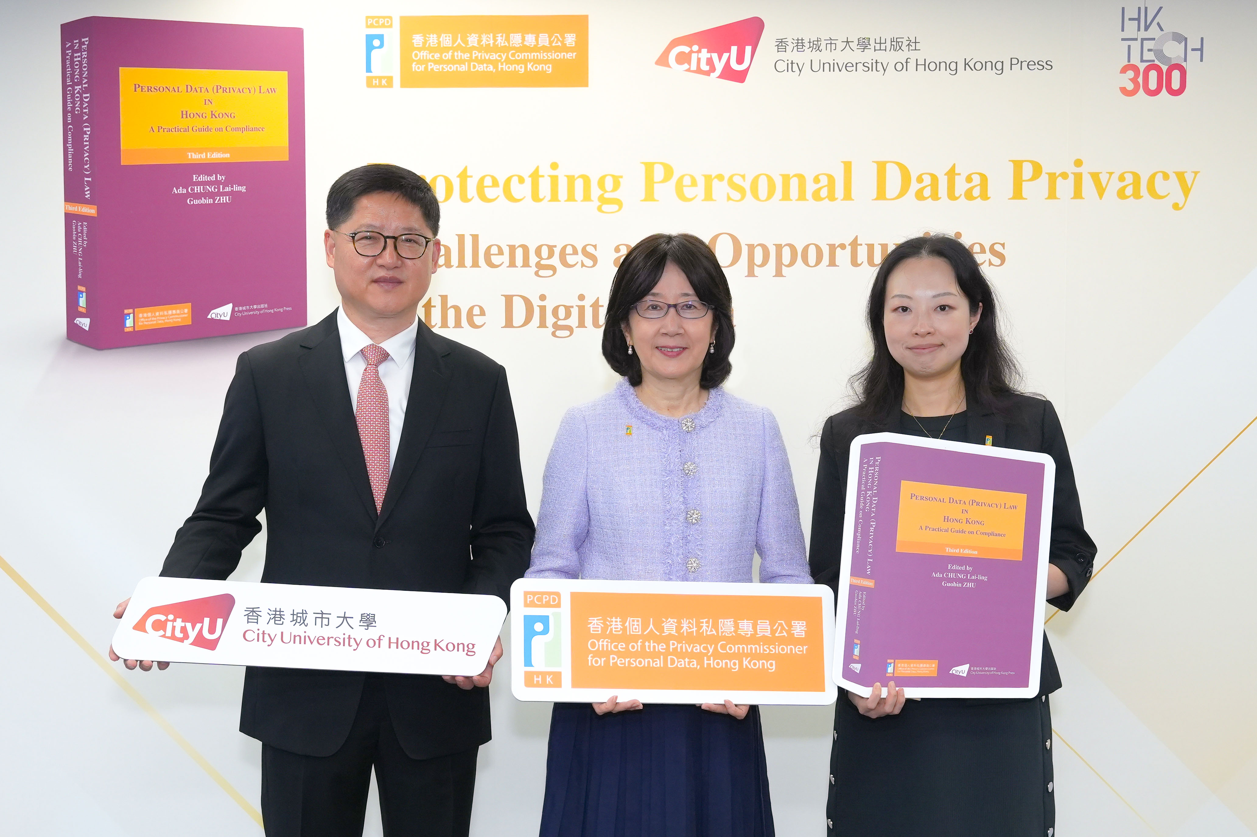 私隐专员钟丽玲(中)、香港城市大学法律学院朱国斌教授(左)及私隐专员公署助理私隐专员(合规、环球事务及研究)王雅媛(右)摄于研讨会。