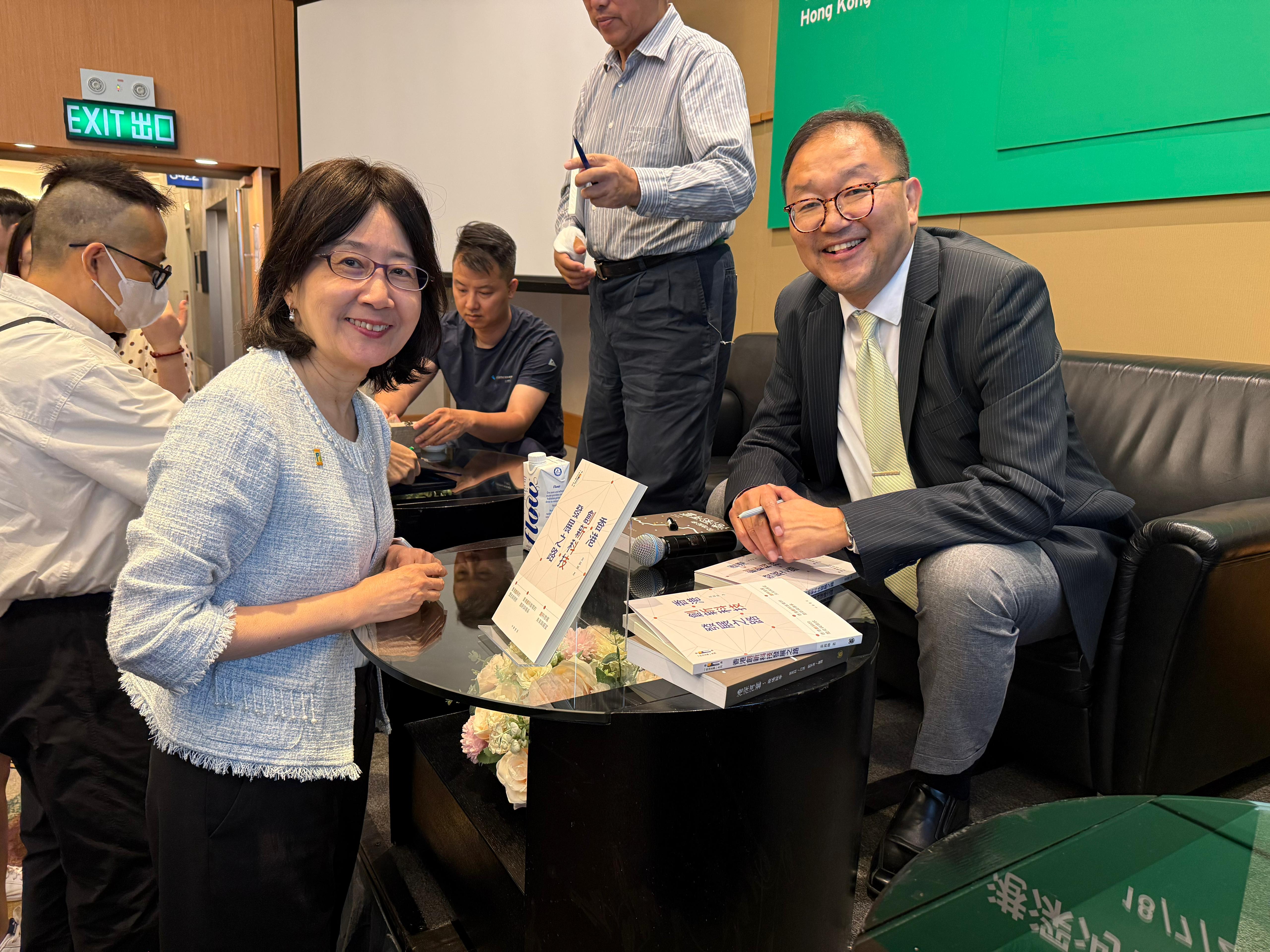 私隐专员钟丽玲(左)出席黄锦辉教授(右)撰写的《香港创新科技发展之路》新书发布会。