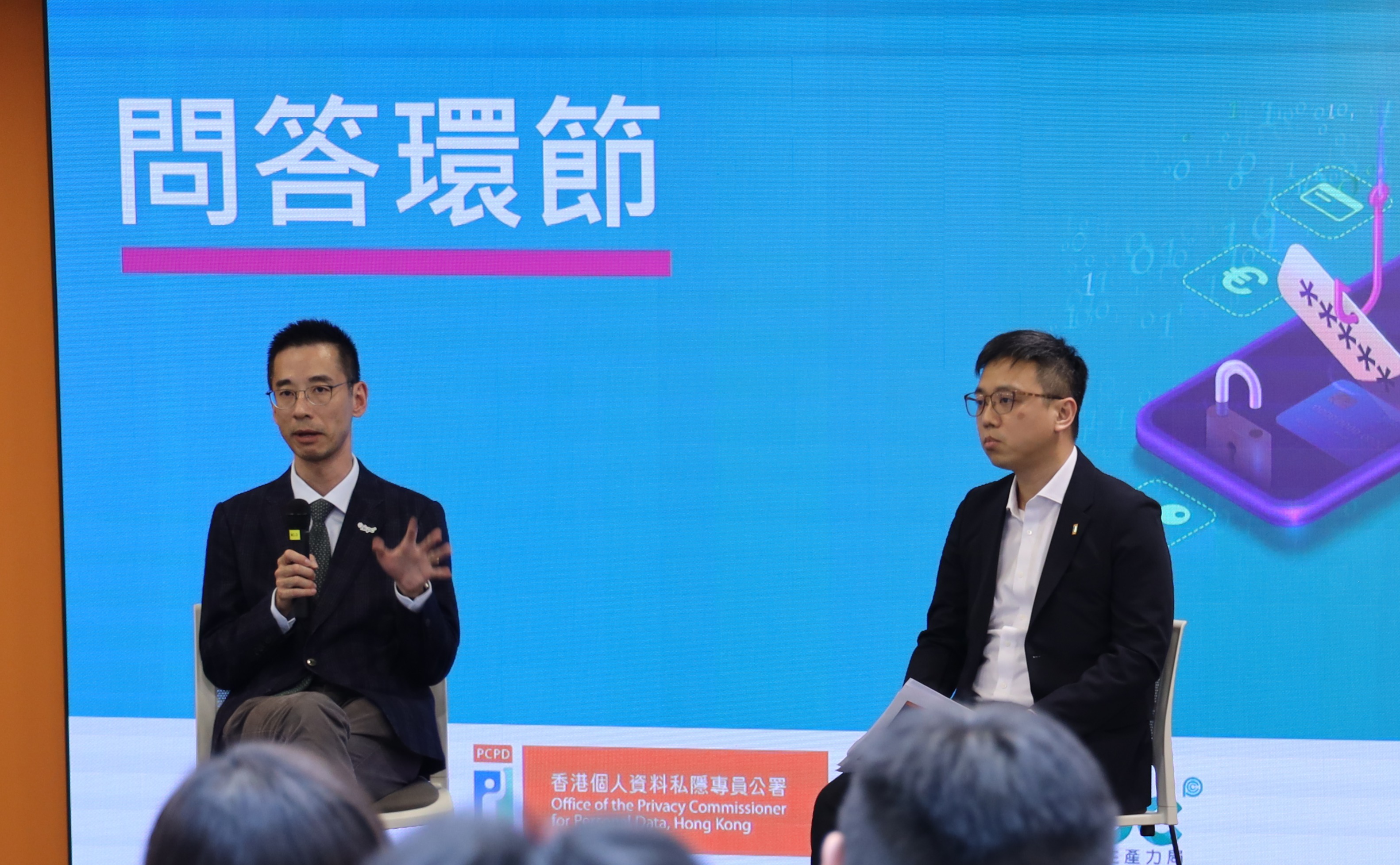 私隐专员公署署理高级个人资料主任(资讯科技)谭嘉荣(右)与生产力局数码转型部总经理陈仲文工程师(左)于研讨会上解答参加者提问。