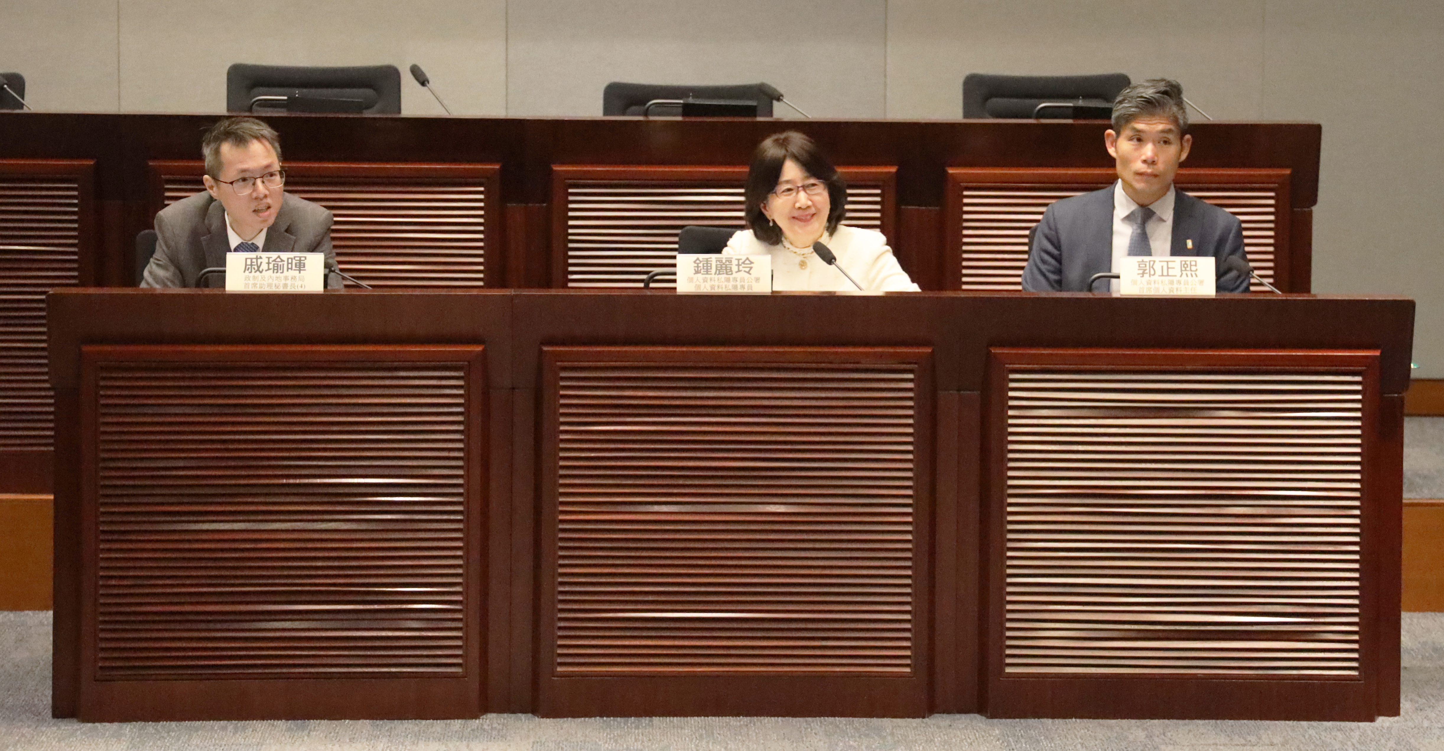 私隱專員鍾麗玲(中)出席立法會政制事務委員會會議。