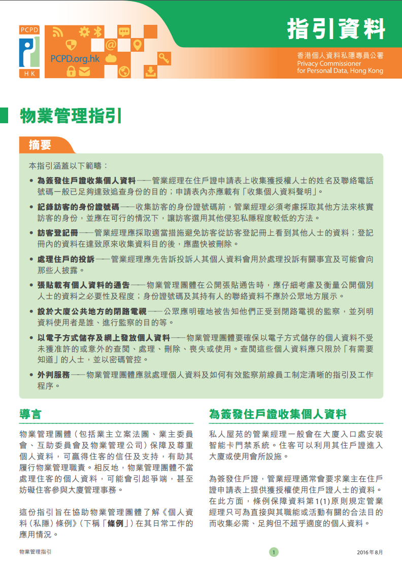 物業管理業的工作範疇涉及接觸大量業戶與僱員的個人資料,為提高物業管理團體(包括物業管理公司、業主立案法團、業主委員會等)對保障業戶及僱員個人資料私隱的意識,香港個人資料私隱專員公署(私隱公署)聯同物業管理業監管局舉辦了一系列物業管理行業保障私隱活動。