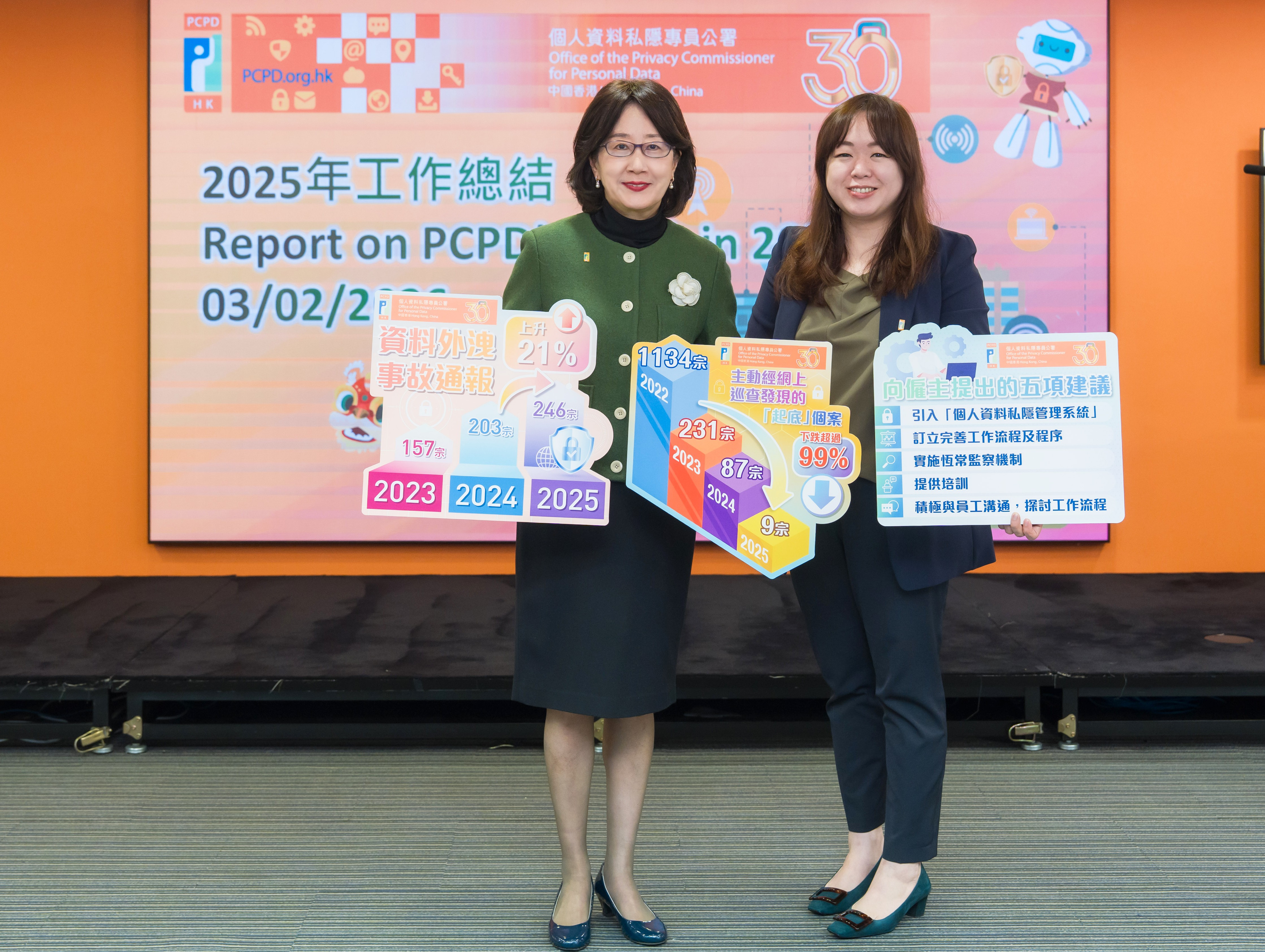 私隱專員鍾麗玲(左)及助理個人資料私隱專員(投訴及刑事調查)何芹若(右)講解公署2025年工作報告及三宗涉及僱員個人資料保安的事故。