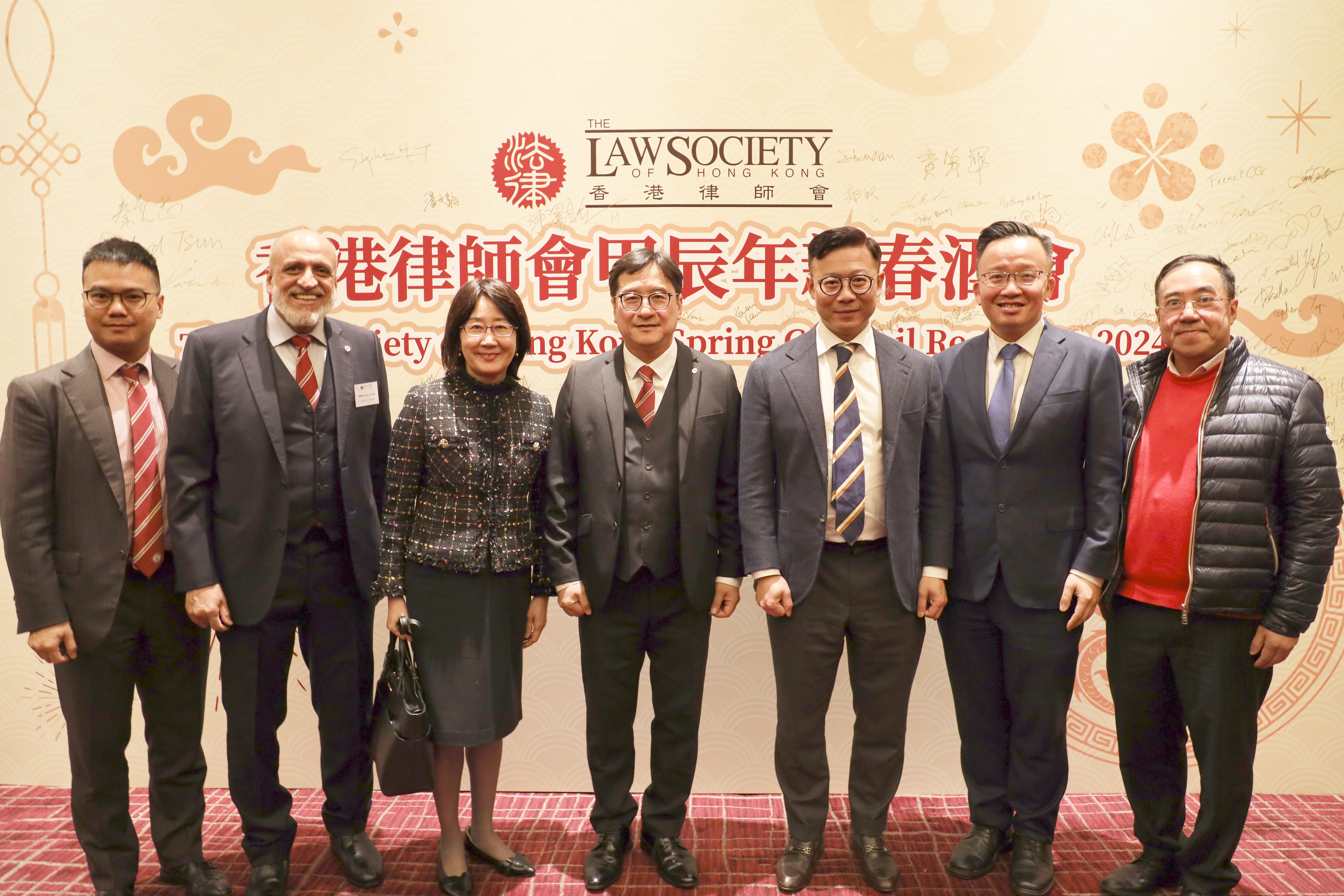 私隱專員鍾麗玲(左三)出席香港律師會甲辰年新春酒會,並與香港律師會會長陳澤銘(中)、律政司副司長張國鈞, SBS, JP(右三)、香港律師會副會長黎雅明(左二)及其他嘉賓合照。