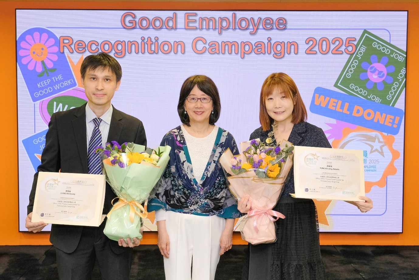 獲獎的兩名私隱專員公署主任分別為投訴部個人資料主任容潔瑩,以及法律部助理個人資料主任梁健強。