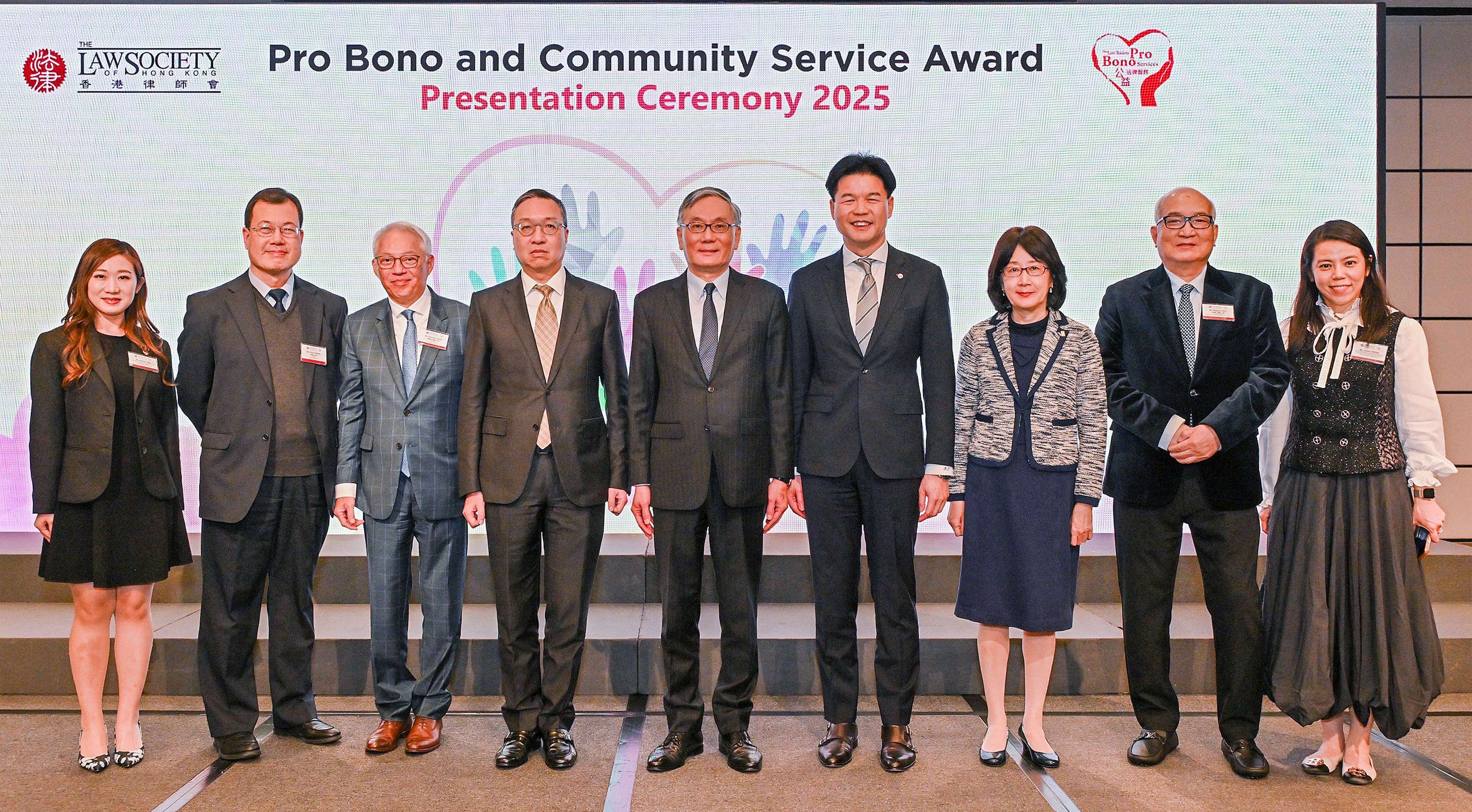 私隱專員鍾麗玲(右三)出席2025年公益法律服務及社區工作頒獎典禮擔任頒獎嘉賓,並與終審法院首席法官張舉能, GBM(中)、律政司司長林定國, GBS, SC, JP(左四)、律師會會長湯文龍(右四)及其他嘉賓合照。